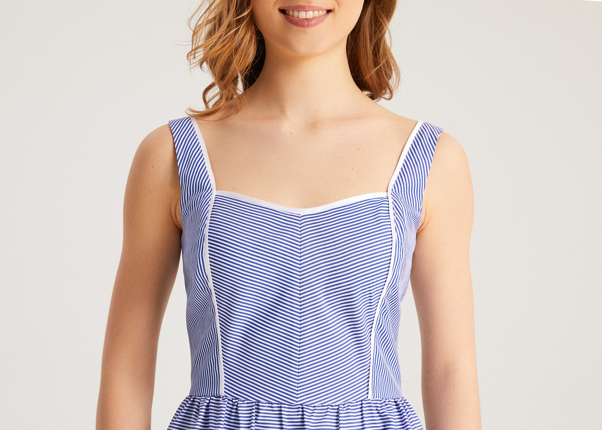 Sleeveless dress with a square-cut neckline and contrasting piping, decorative pleats at the waist , zip fastening on the side and two side pockets.