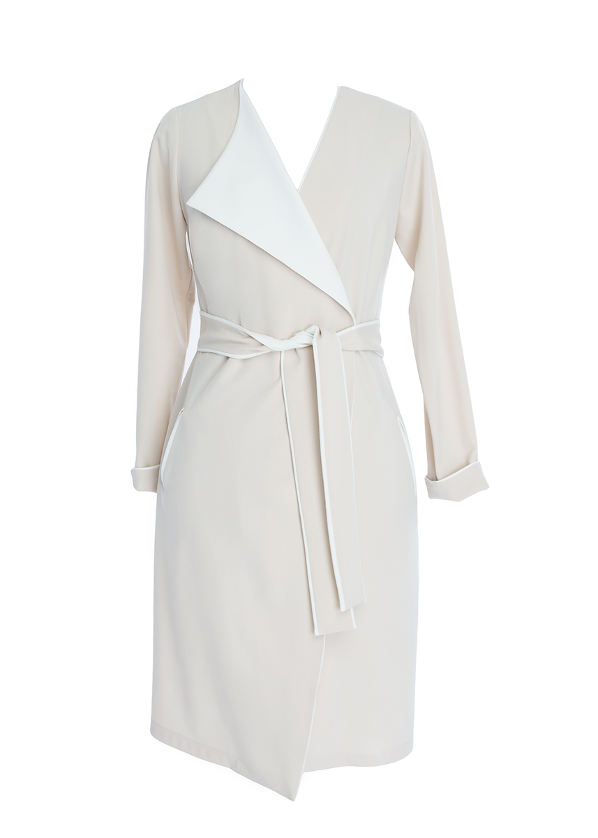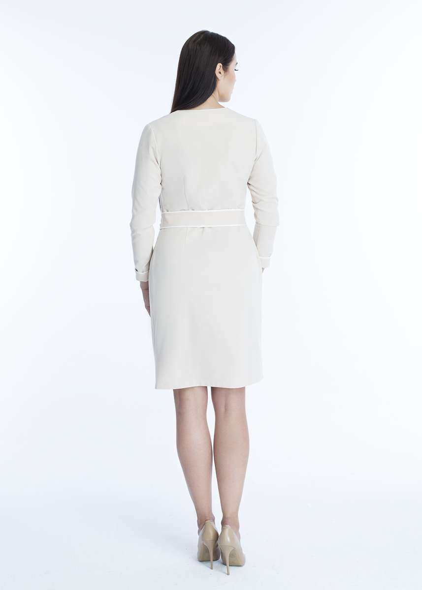 Midi wrap dress with contrasting piping. Featuring an A- line fit, a V-neckline, long sleeves and tie belt.